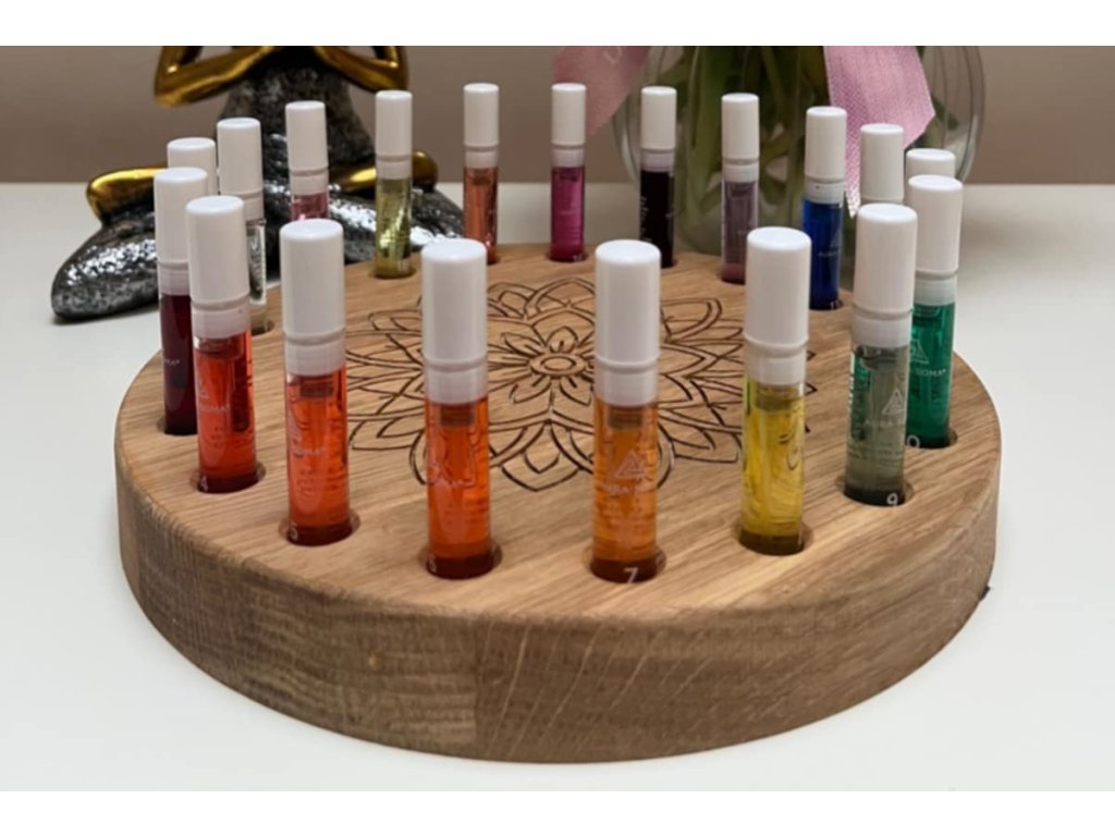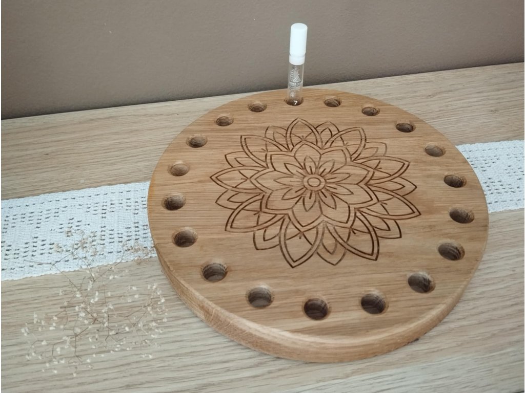 Frézovaný tácek z dubového masivu pro umístění kulatých lahviček. Rozměry Dxh-22,5 x2,8cm